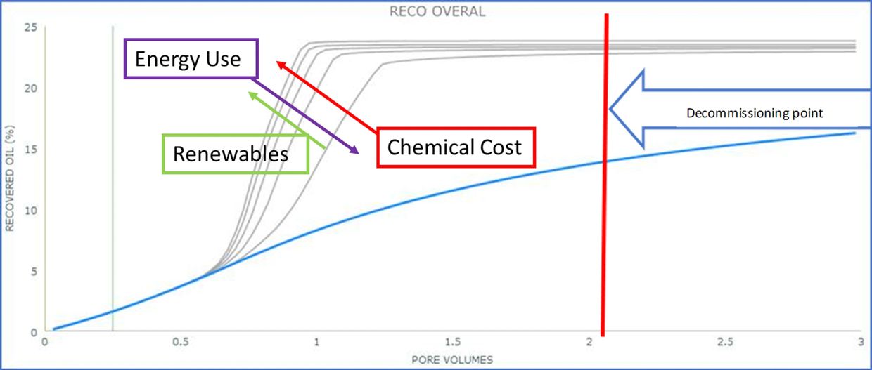 An important application of Chemical EOR is the reduction of energy consumption by reducing the separator power requirements that result from high water cuts. Energy consumption is a strongly nonlinear function of the produced water cut, so using CEOR to reduce water cut can have a significant environmental and cost benefit. This is illustrated in Figure. 4, which shows the oil recovery for polymer floods with a range of injected polymer concentrations, from zero (blue line) to 0.5 wt%. Oil production is significantly accelerated with higher polymer concentrations, leading to lower water cuts and therefore lower energy consumption and environmental impact. Again, correctly estimating the potential benefit of CEOR for reducing energy and environmental costs really requires the use of ensemble modelling. Using ensemble modelling in the evaluation of field development plans can result in fewer and better-targeted wells, with large savings in energy consumption and time to extract the oil. Reducing the time from drilling to the decommissioning point (see Figure. 4) helps to lower the overall carbon footprint of the reservoir as well as producing a faster and more profitable return. This is especially true when using CEOR processes, where the cost of chemicals can be significantly reduced, resulting in a de-risking of the CEOR project.