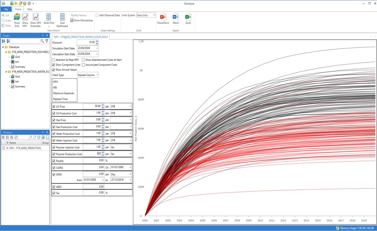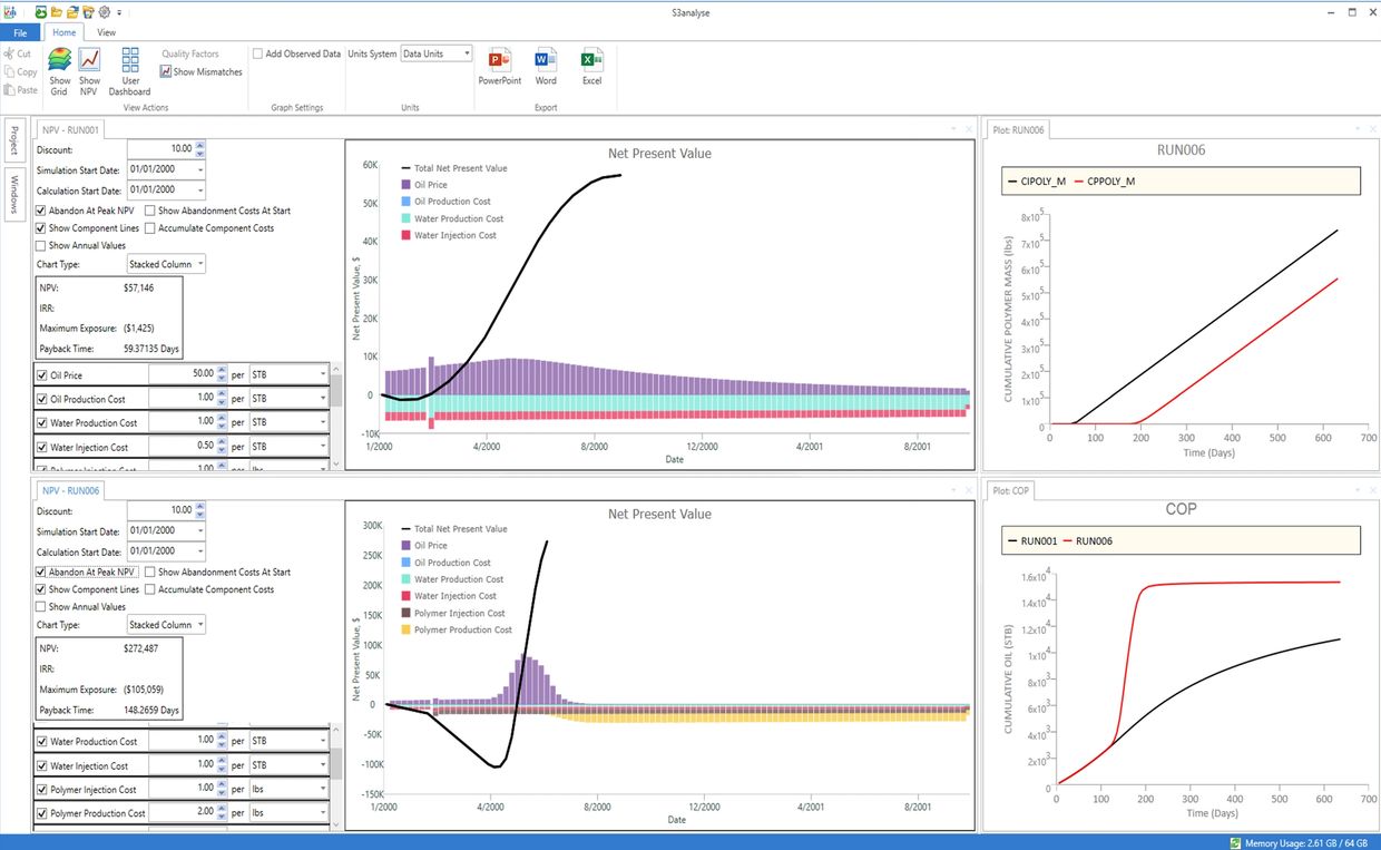 One of the key measures for evaluating alternative field development plans is the Net Present Value (NPV), which discounts future revenue and expenditure back to their present value, to provide a consistent basis for comparison of long-term projects. This is especially important for Chemical EOR projects, where initial capital expenditure on chemical infrastructure, and ongoing chemical costs have an important bearing on the viability of CEOR projects. For example, Figure. 1 shows the NPV View in Sciencesoft’s S3analyse software for waterflood (top) and polymer flood (bottom) simulation cases, for the same reservoir model. The operating costs (the costs of injecting and producing fluids and chemicals) and the oil price are specified, along with the discount rate, taxes, royalties, etc. Using these values, and the simulated injection and production rates, the change in NPV with time is calculated. The stacked histogram bars show the contributions to the NPV from different sources in each time period. Note that the NPV for the polymer flood is significantly negative at early times as a result of the polymer cost, before the increase in oil production (caused by the banking of oil by the injected polymer) kicks in.