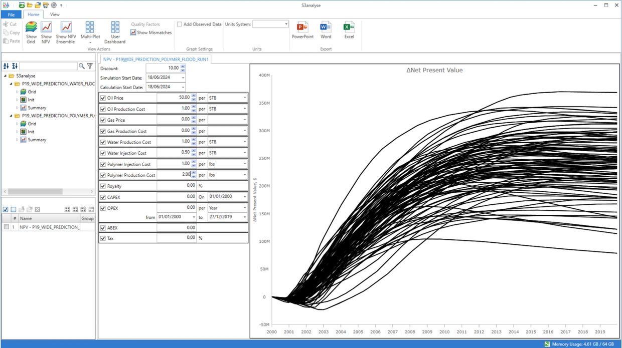 Failing to model the reservoir uncertainty can lead to an incorrect estimation of the value of a project. To illustrate this, consider the ensemble NPV plots from S3analyse in Figures. 2 and 3. These show the effect of subsurface uncertainly on the calculated NPV for a pilot study (based on a sector of a full-field model), comparing the NPVs for a simple waterflood and a polymer flood. The ensemble that is the basis of this study was generated by selecting a pilot region from a full-field model and automatically generating sector models (using Sciencesoft’s S3quickbuild software) from each case in the full-field ensemble for the pilot region. These were each then run with water injection and polymer injection. Figure. 2 compares the spread of NPV values for the waterflood (red) and polymer flood (black), for each ensemble case. The benefit of the polymer flood is clear, although the spread in NPV is wide.